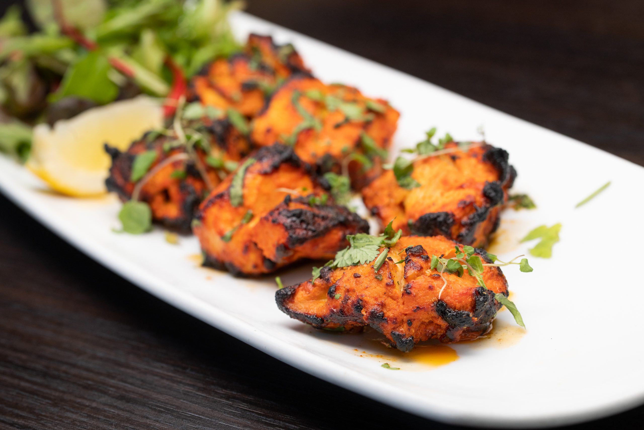 cubes, grilled in a tandoori oven, glazed with butter, and garnished with caramelized onions