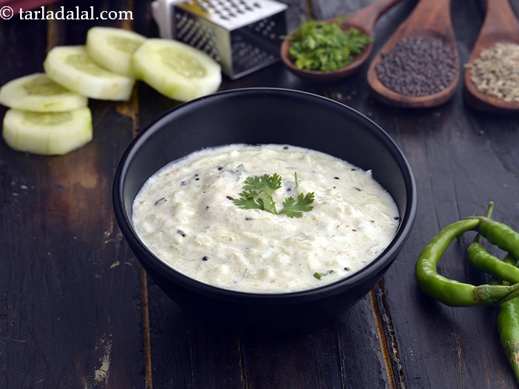 Plain yogurt, salt, spices, mint, mixed with cucumber