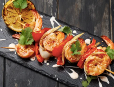 Pre-marinated king prawn, onion, bell pepper and tomatoes skewers grilled in a flaming tandoori oven, glazed with quality